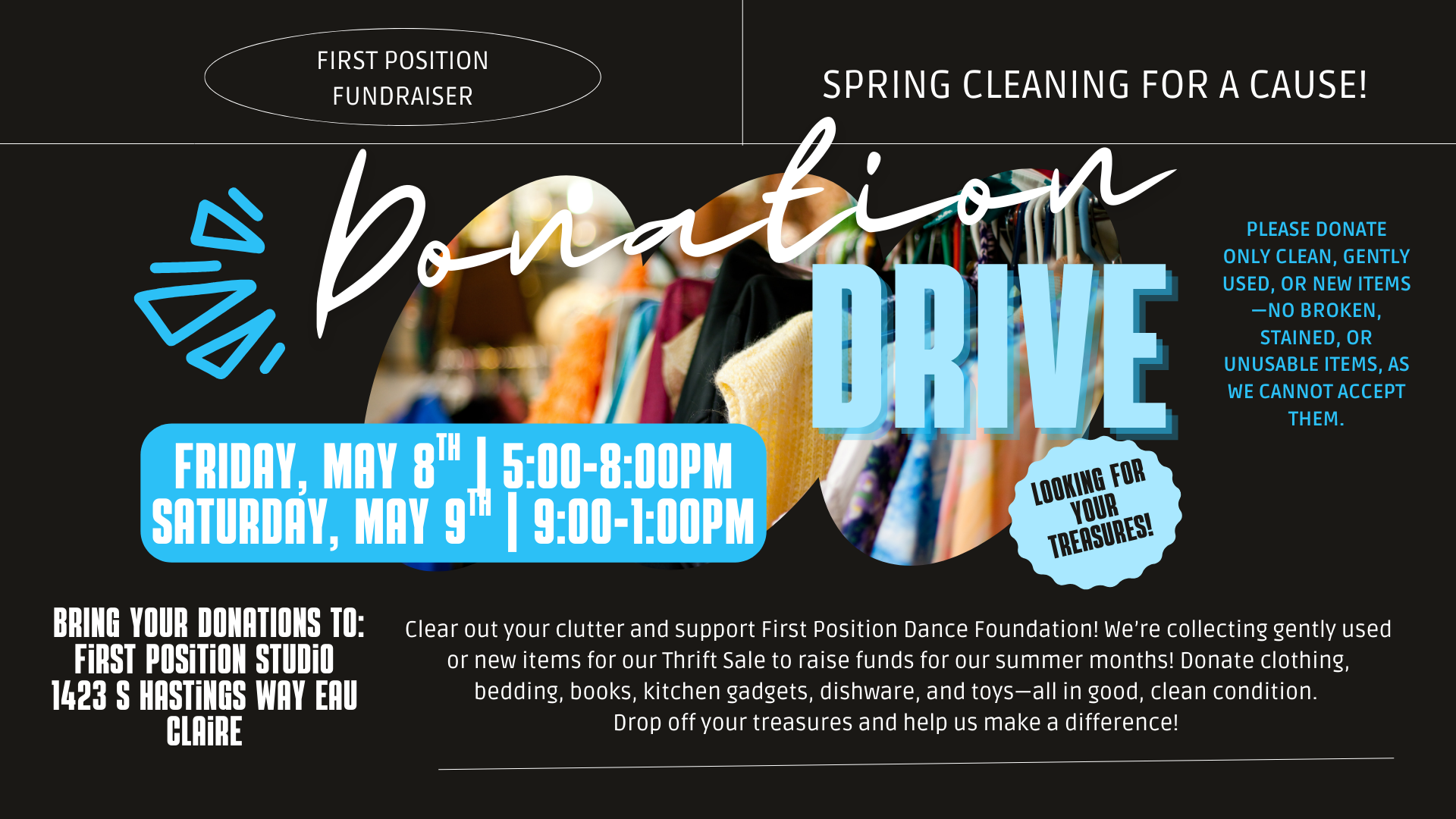 We’re so excited to host our upcoming donation drive in support of our annual thrift sale! This is a simple and impactful way for our community to come together, clear out gently used items, and help support the mission of our studio.